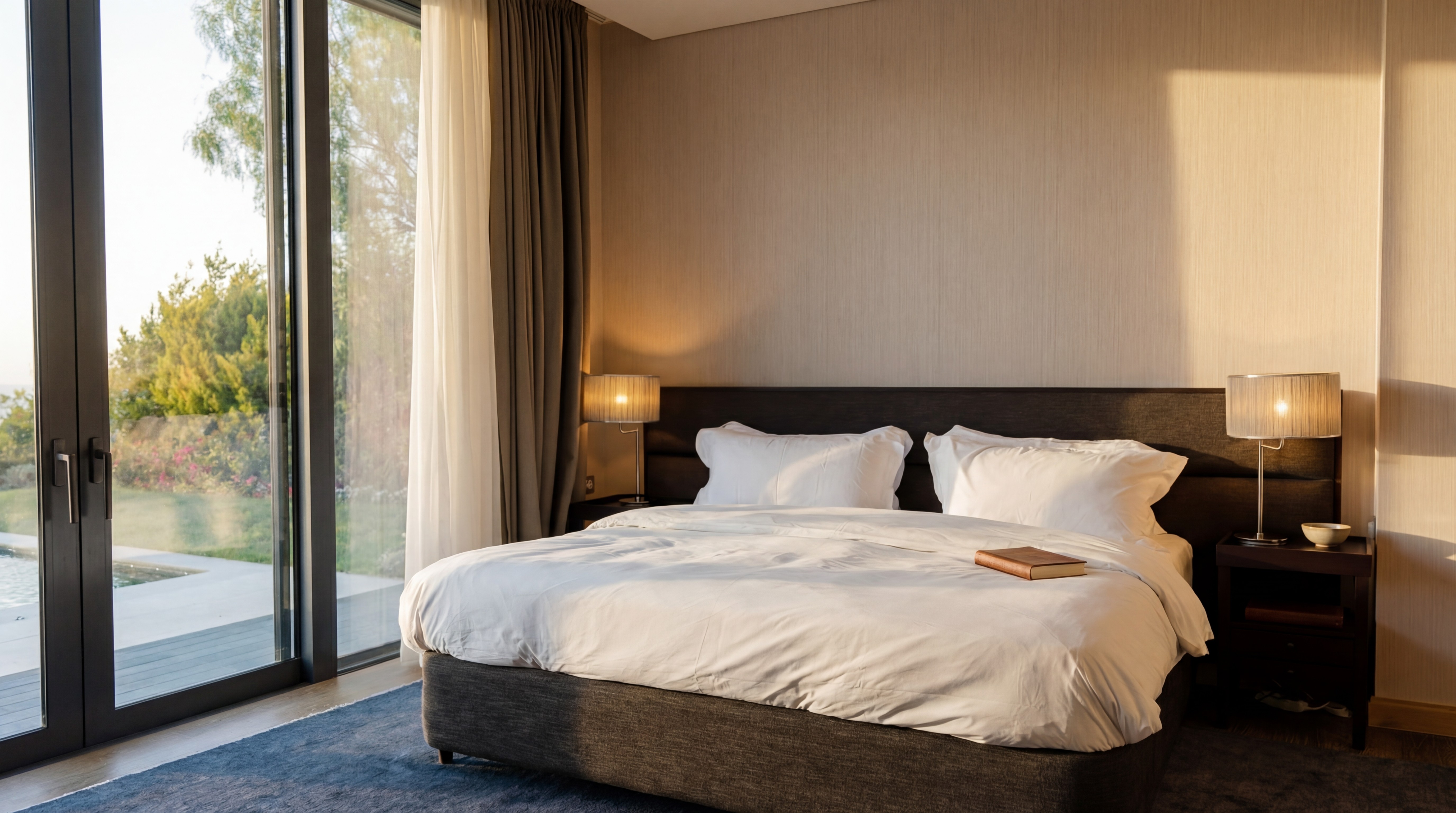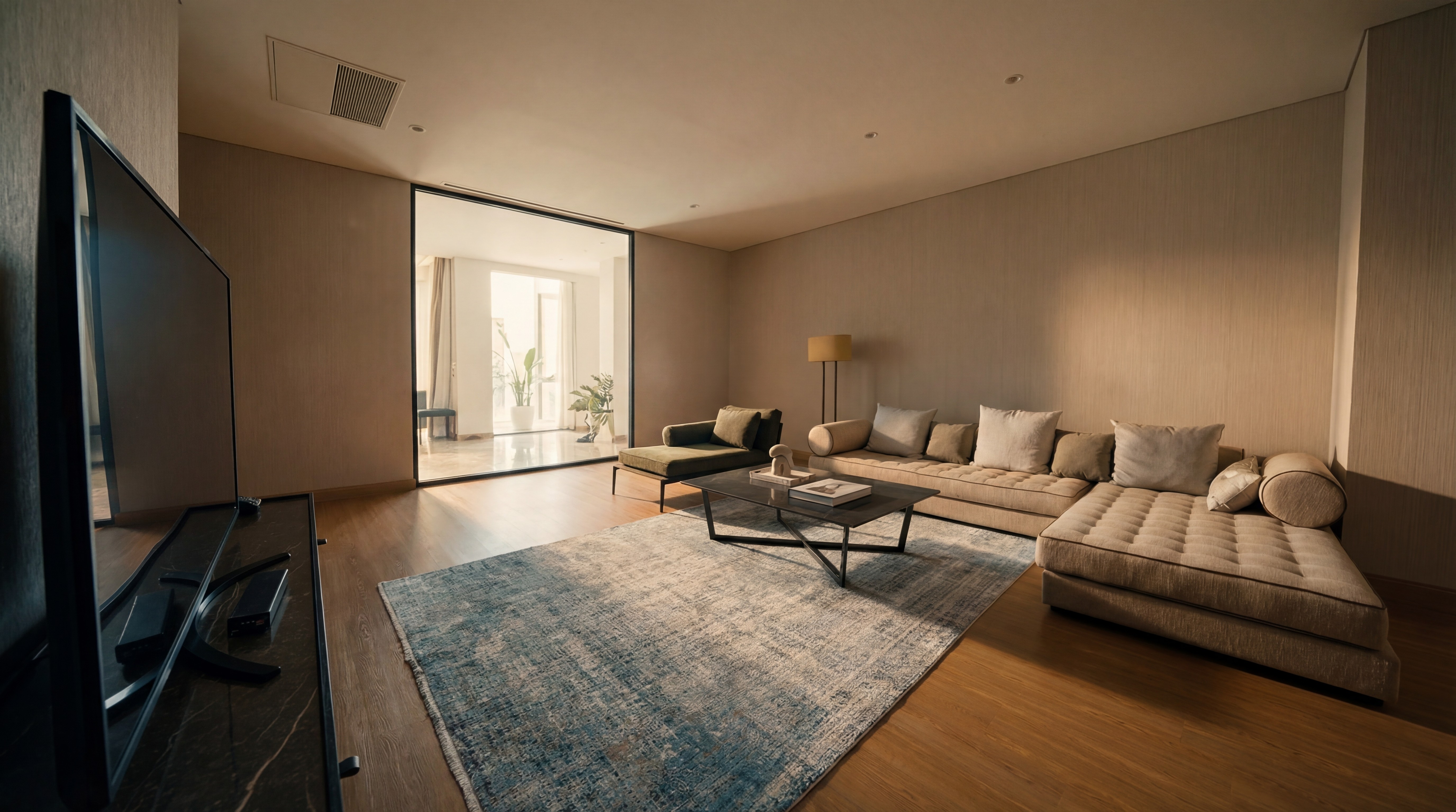INTERIORS ARE THOUGHTFULLY DESIGNED WITH NATURAL TONES, BESPOKE FURNISHINGS, AND FLOOR-TO-CEILING OPENINGS THAT INVITE LIGHT THROUGHOUT THE DAY, WHILE MAINTAINING A SENSE OF CALM AND PRIVACY.